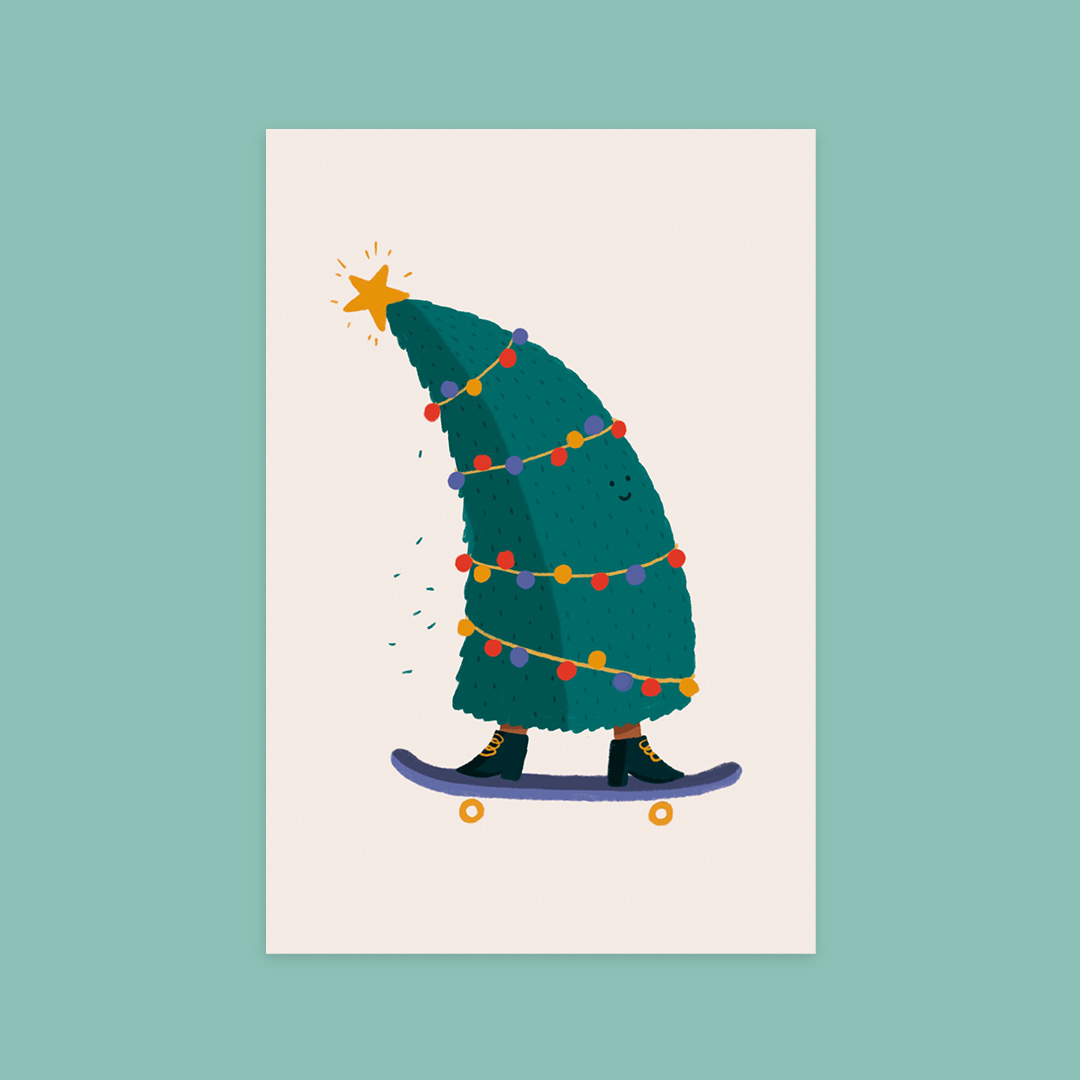 Illustration d’un sapin sur son skate pour offrir une jolie carte à noël !