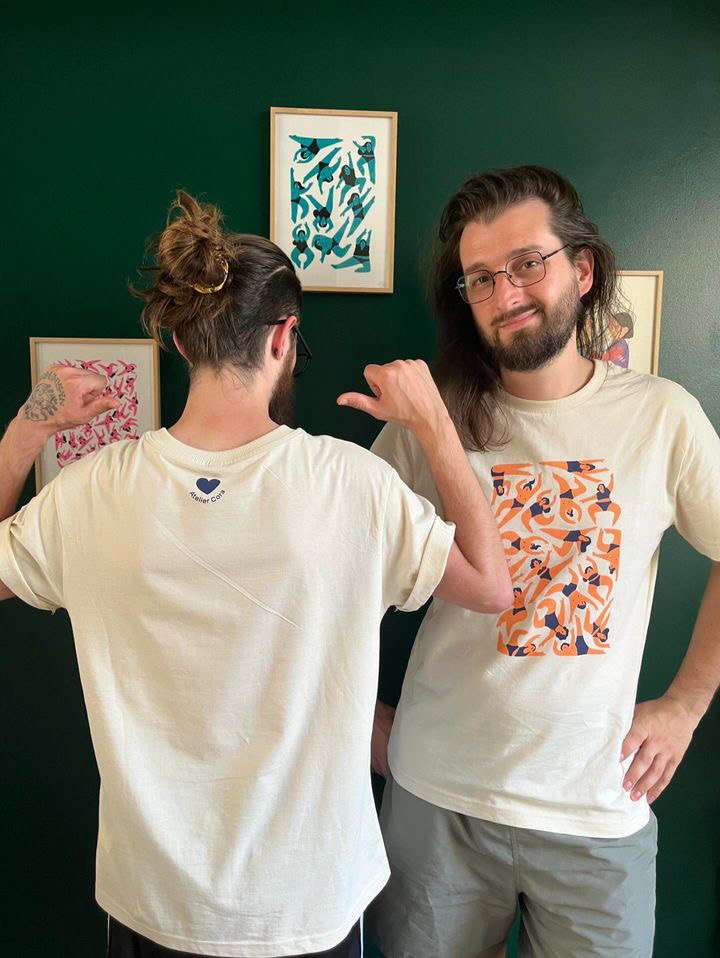 Un tee-shirt imprimé à la main à Orléans en Sérigraphie. Version corail et bleu nuit.